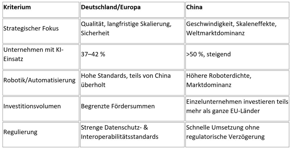 Deutschland/Europa und China verfolgen in der KI-gestützten Produktion deutlich unterschiedliche Strategien. Deutschland setzt auf Qualität, langfristige Skalierung und Sicherheit, während China mit hoher Geschwindigkeit, massiven Skaleneffekten und globalem Expansionsdrang agiert.