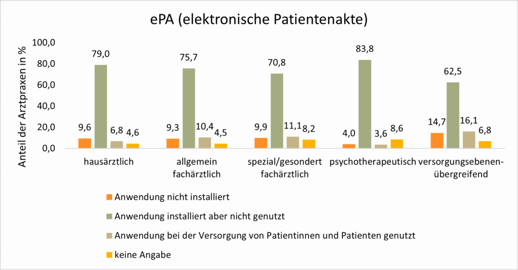 Noch nicht im Praxisalltag angekommen, ist die elektronische Patientenakte (ePA), die zwar mehrheitlich installiert ist, aber nur von einem kleinen Anteil genutzt wird.