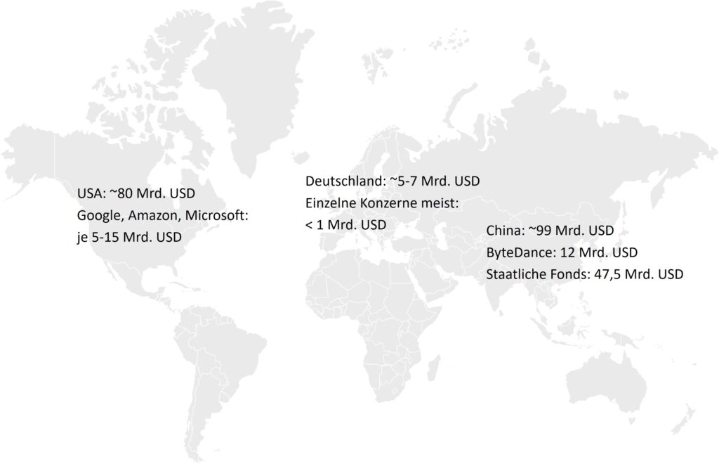 Ein Blick auf die weltweiten Investitionen in KI für die Produktion zeigt erhebliche Unterschiede in der finanziellen Schlagkraft der führenden Industrieländer – mit China klar an der Spitze, gefolgt von den USA und mit deutlichem Abstand Deutschland.