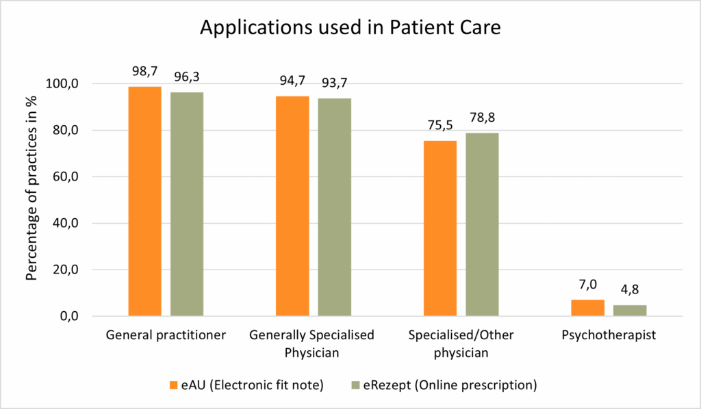 Electronic Fit notes (eAU) and online prescriptions (eRezept) have become part of the routine in practices. Across care levels, 95.1 percent surveyed practices use the eAU and 94.1 percent use the eRezept for their patients.