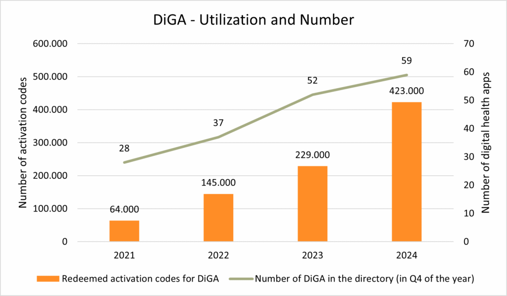 Between September 2020 and December 2024, over 1 million DiGA were prescribed by physicians or approved by Statutory Health Insurers. Of these, 861,000 DiGA were used by patients during that period. The number of redeemed activation codes continues to rise, as does the number of apps listed in the official DiGA directory.