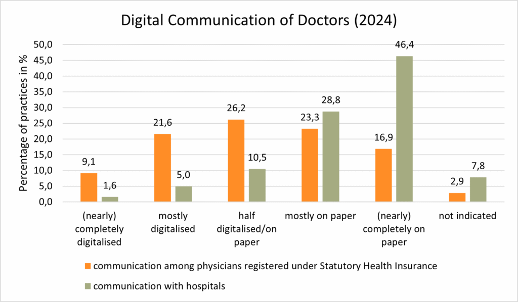 Digital communication between physicians is also not yet fully established. While physicians in practices increasingly communicate with each other via digital channels, paper is still the norm in communication between outpatient practices and hospitals.