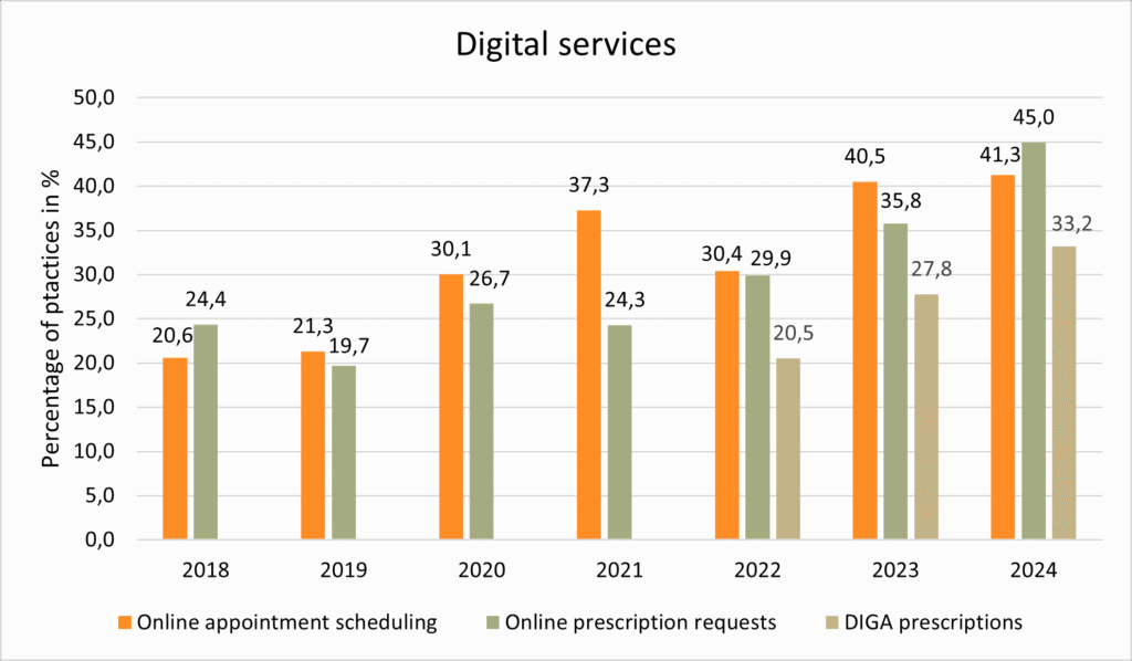 In the outpatient sector, figures from the National Association of Statutory Health Insurance Physicians (Kassenärztliche Bundesvereinigung or KBV) also indicate that practices are increasingly becoming digitalised. According to KBV surveys, there has been a significant increase in digital services offered by physician practices since 2018. This is evident in the growing use of Digital Health Apps (DiGA) online appointment booking. Electronic fit notes (eAU) and electronic prescriptions (eRezept) have also been integrated into practice routine.